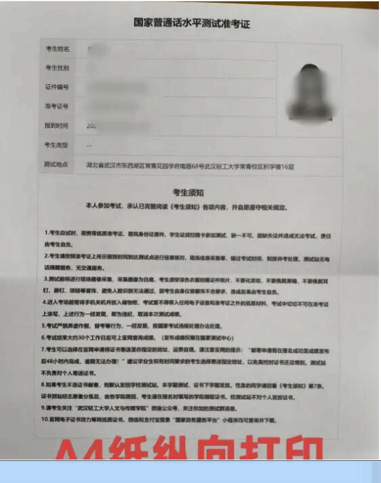 2 . 准 考 证 一 定 要 纸 质 版 !( 要 放 在 考 试 间 摄 像 头 下 的 ) 请 同 学 们一 定 及 时 下 载 打 印 准 考 证 , 不 要 卡 点 下 载 , 有 风 险 。 下 载 下 来 检查 后 再 打 印 , 一 定 要 有 照 片 !!! 没 有 就 换 设 备 下 载 , 照 片 是 一 定有的,要求清晰不变形,以免入场时无法核验。请打印 A 4 幅面,纵 向 打 印 , 黑 白 彩 色 均 可 。 普 通 话 等 级 考 试 是 国 家 级 考 试 , 是 严肃 的 , 所 以 准 考 证 字 体 请 用 印 刷 体 , 不 要 用 自 己 设 置 的 卡 通 字 体 !“ 考生类型 ” 一 栏 无 内 容 是 正 常 的 。准考证样例如下: